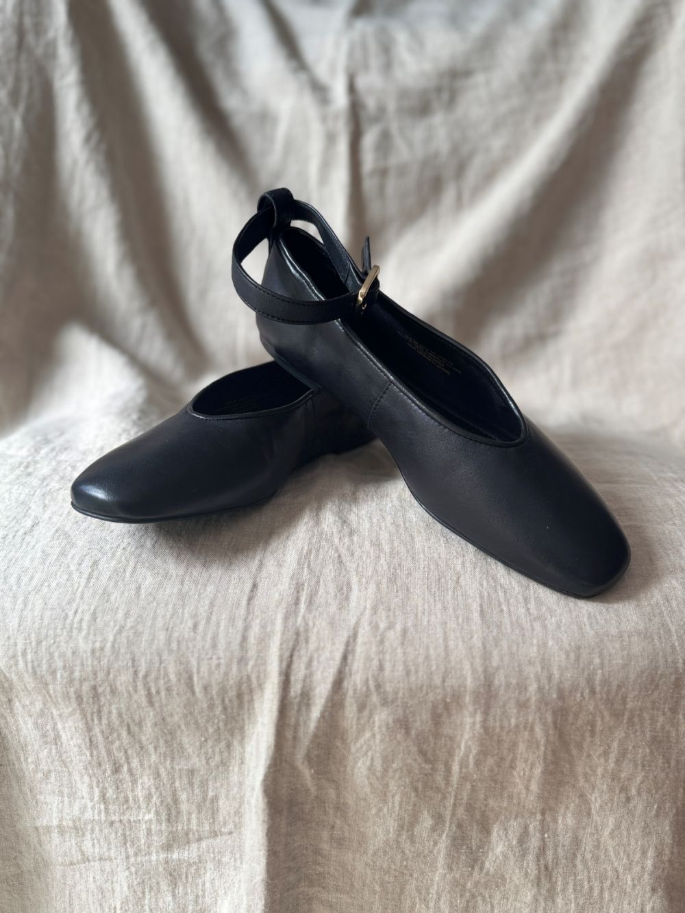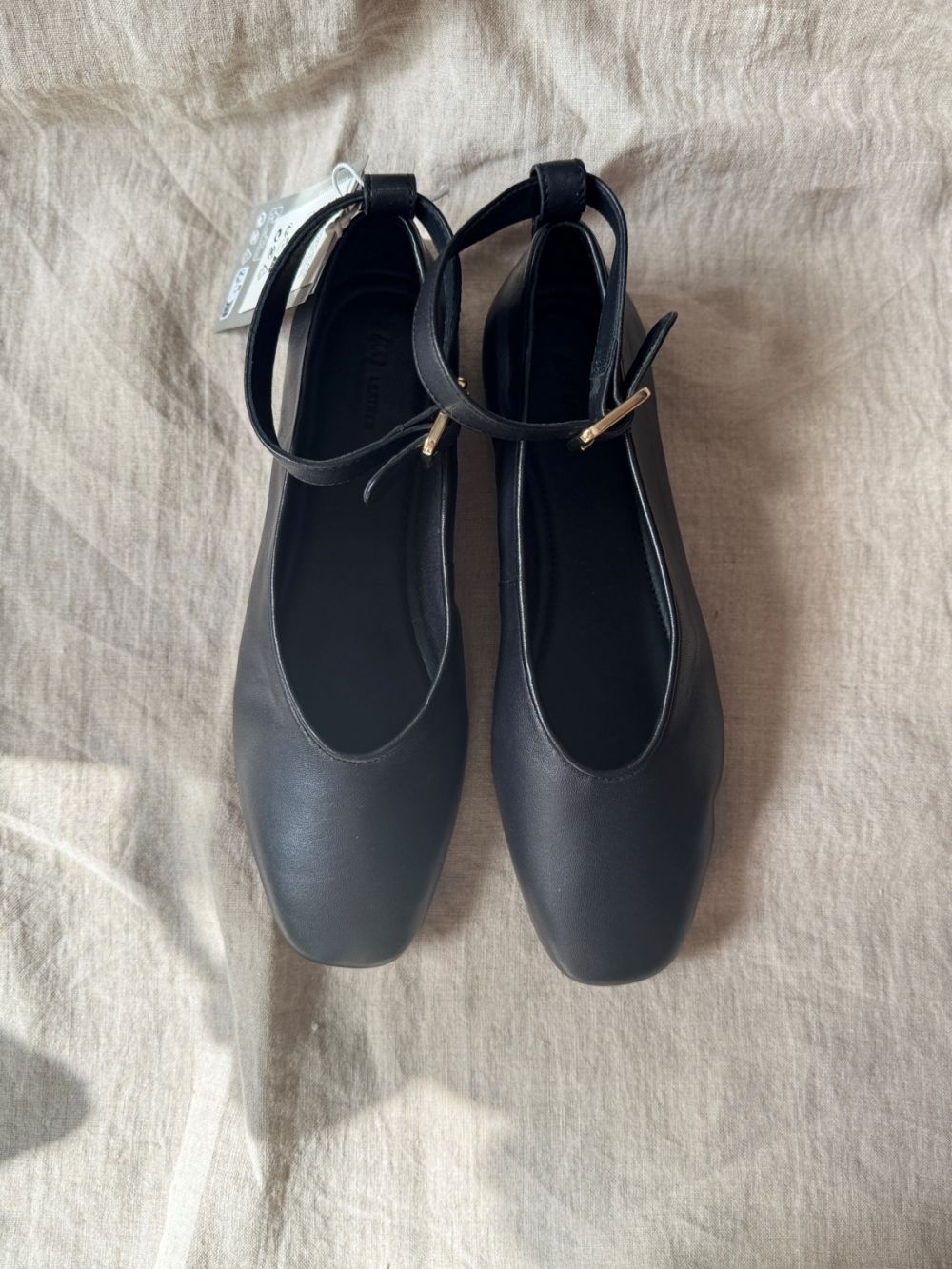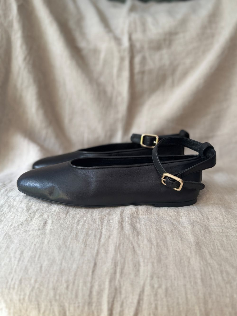 Skórzane baleriny damskie z paskiem czarne minimalistyczne r.39