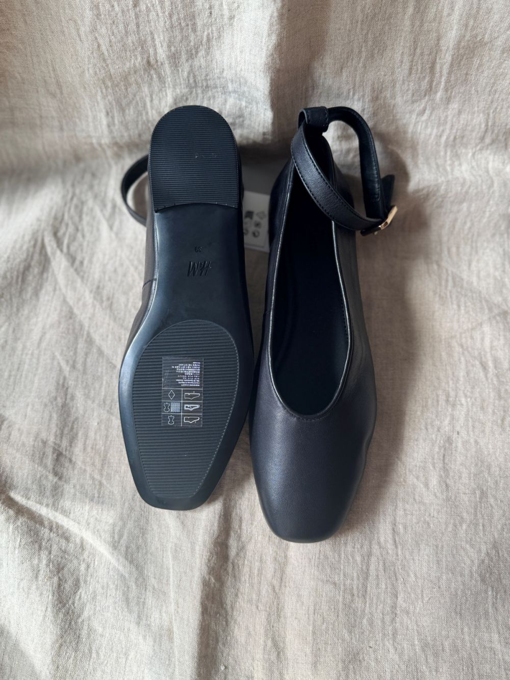 Czarne minimalistyczne skórzane buty baleriny z paskiem na złote zapięcie marki H&M. Buty w stanie idealnym, nienoszone, nadal posiadają oryginalną metkę sklepową.