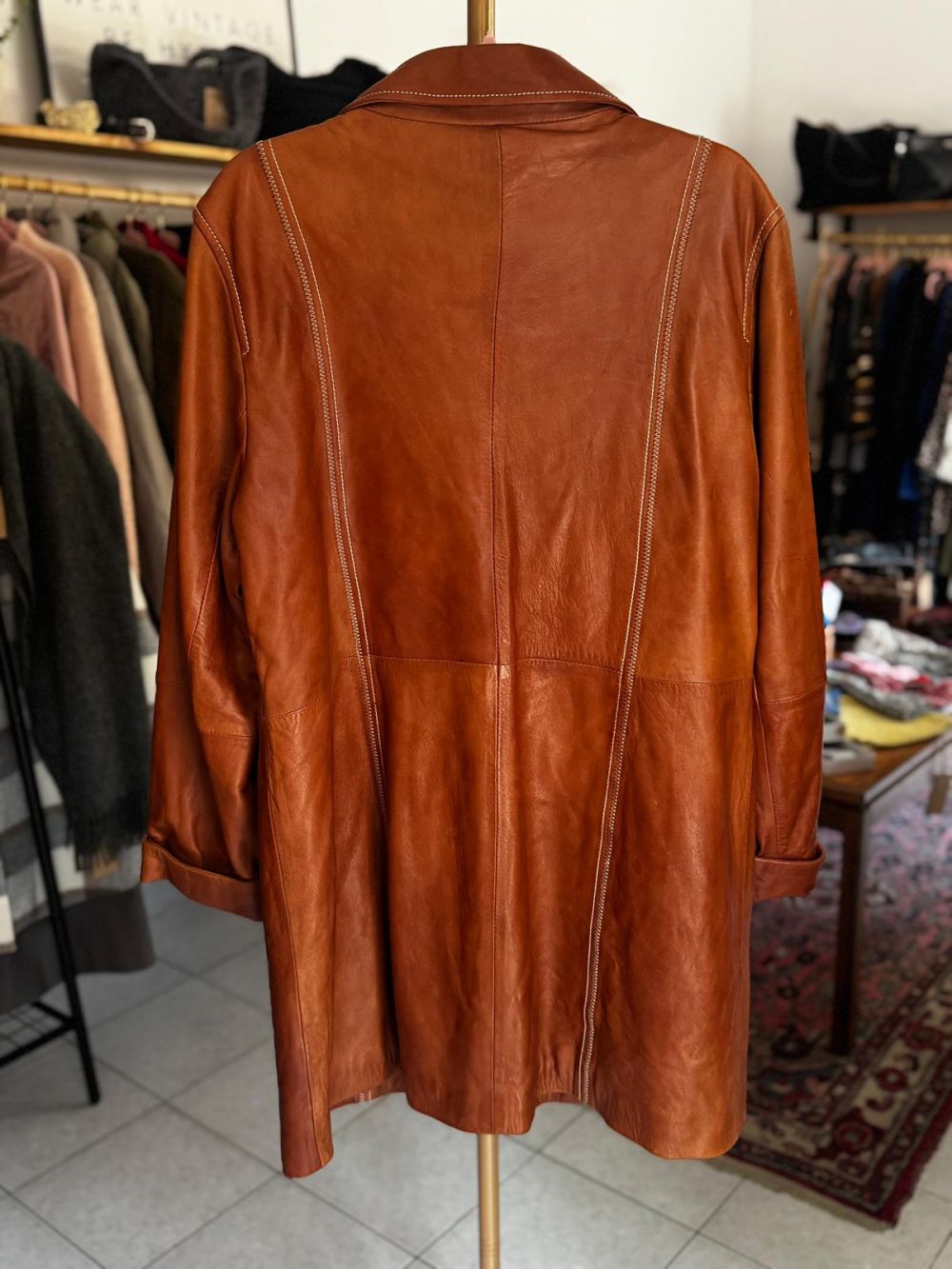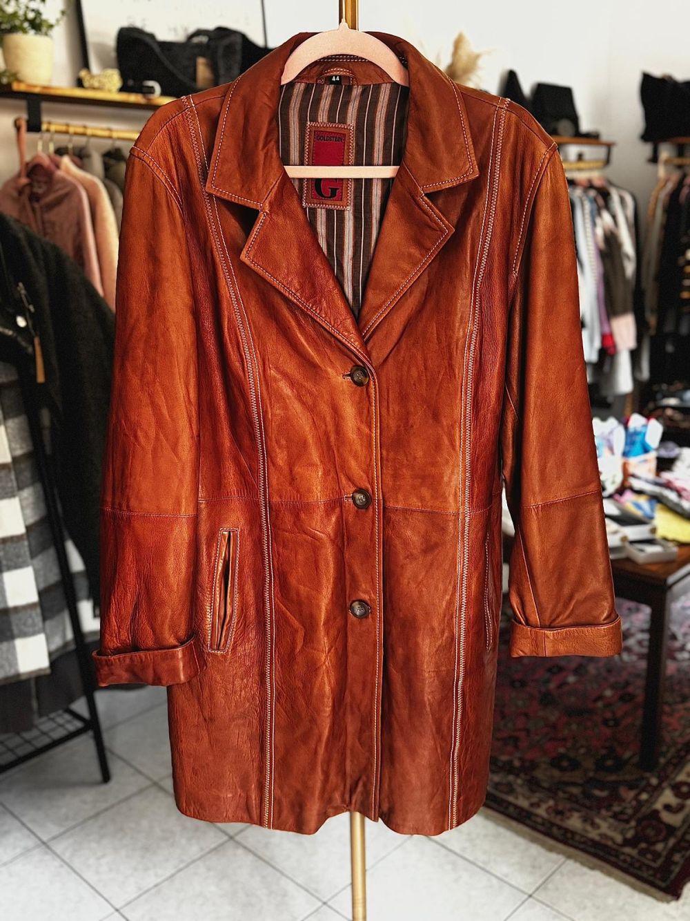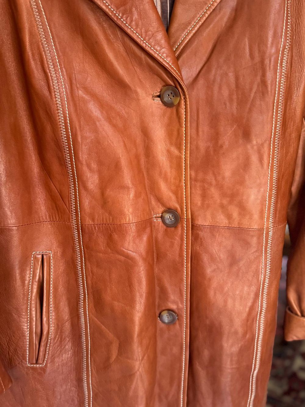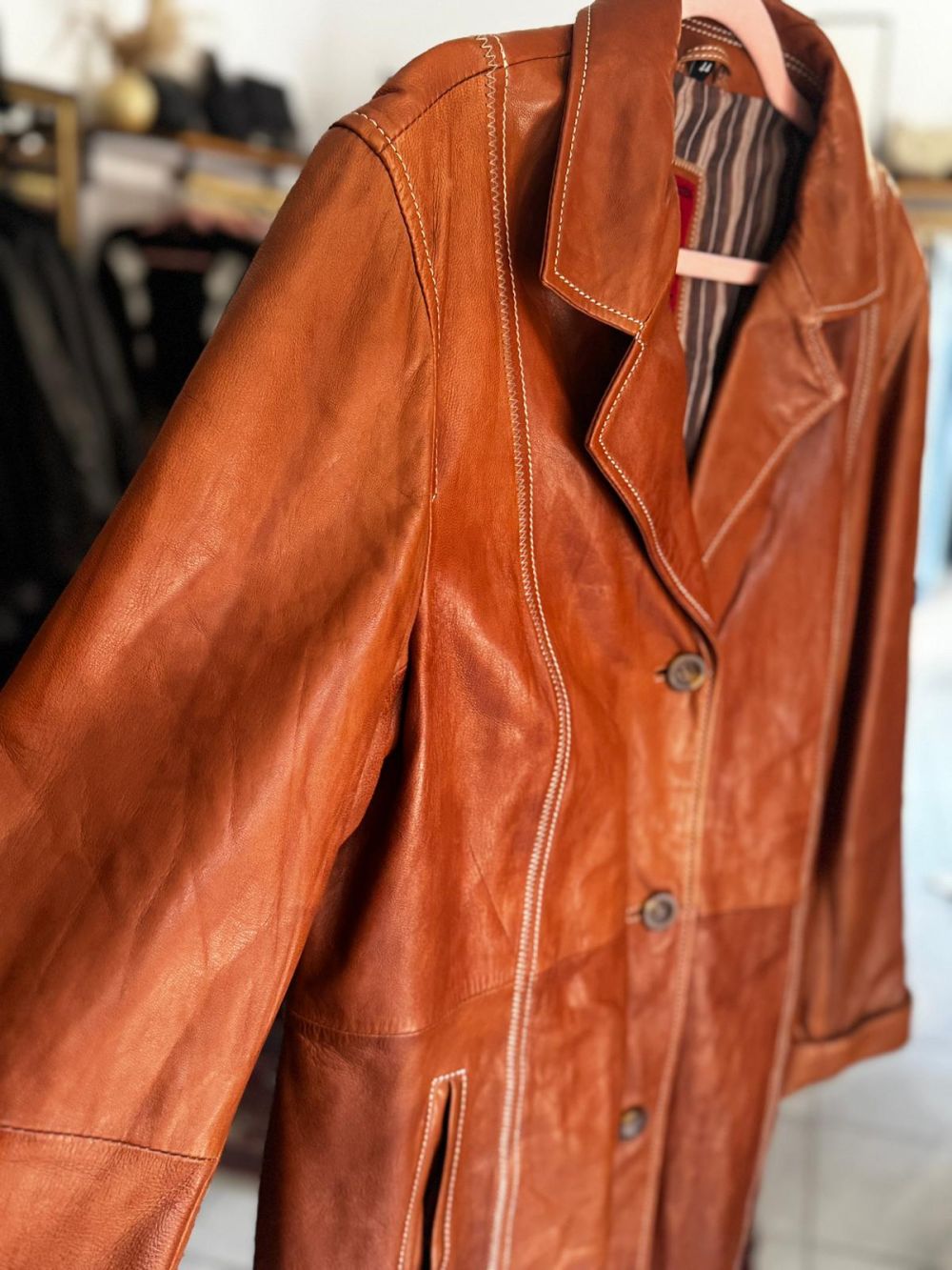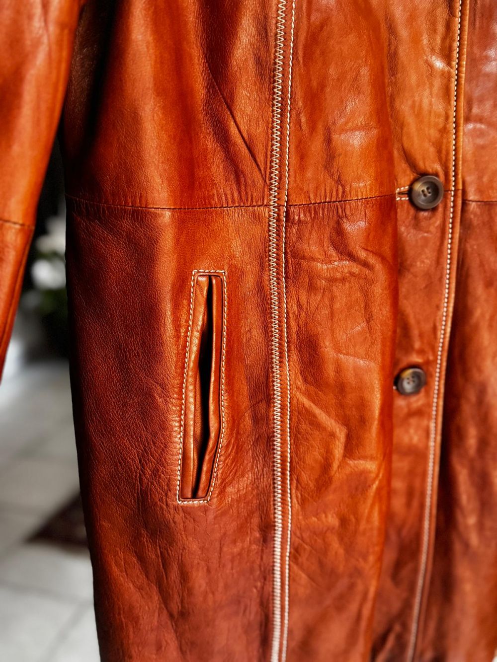 Piękny rudawy płaszczyk wykonany ze skóry. Idealny na wiosenne spacery.