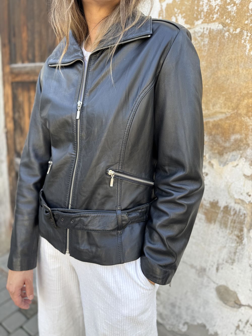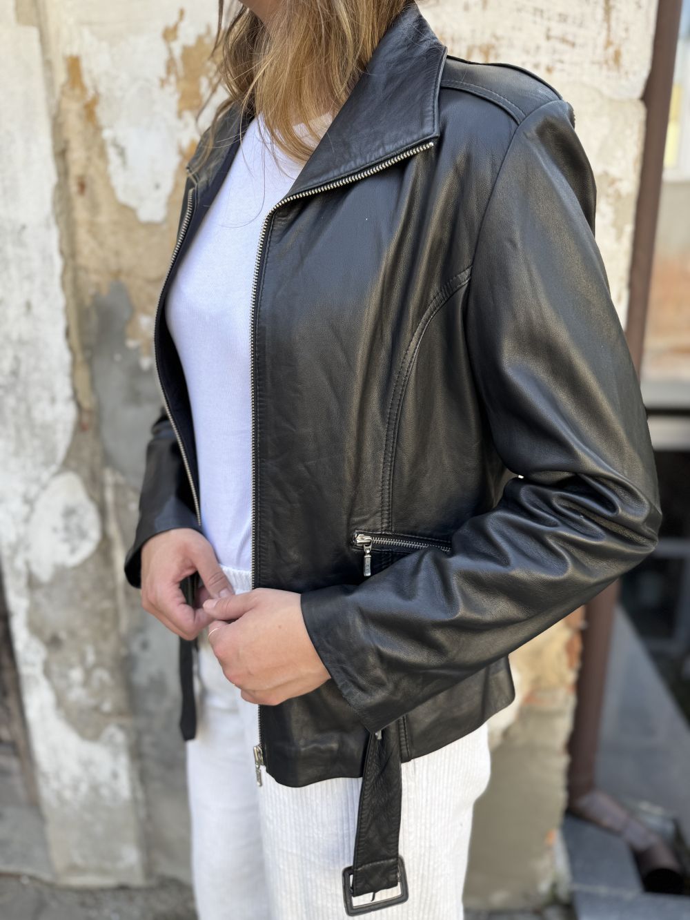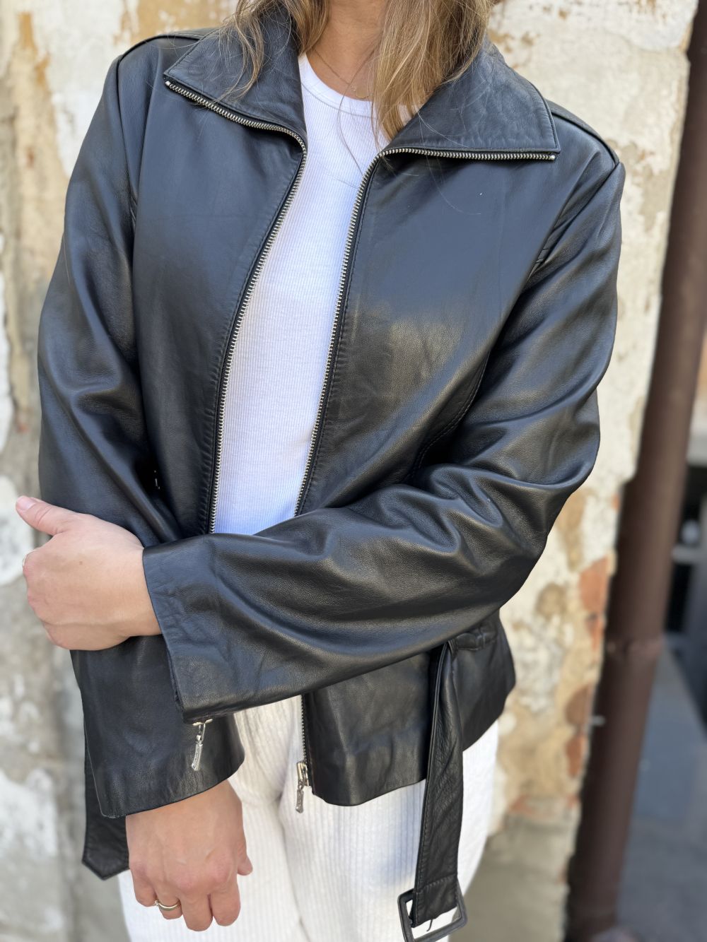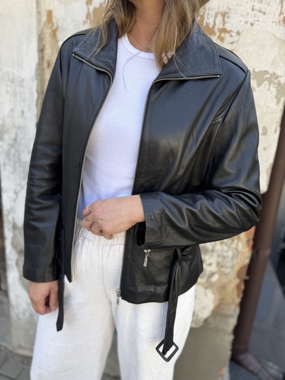 Skórzana kurtka marki TØY&SKIND. Idealnie nadaje się na luźne jesienne stylizacje. Zapinana na suwak, posiada pasek dzięki czemu dopasujemy ją do swojej sylwetki.