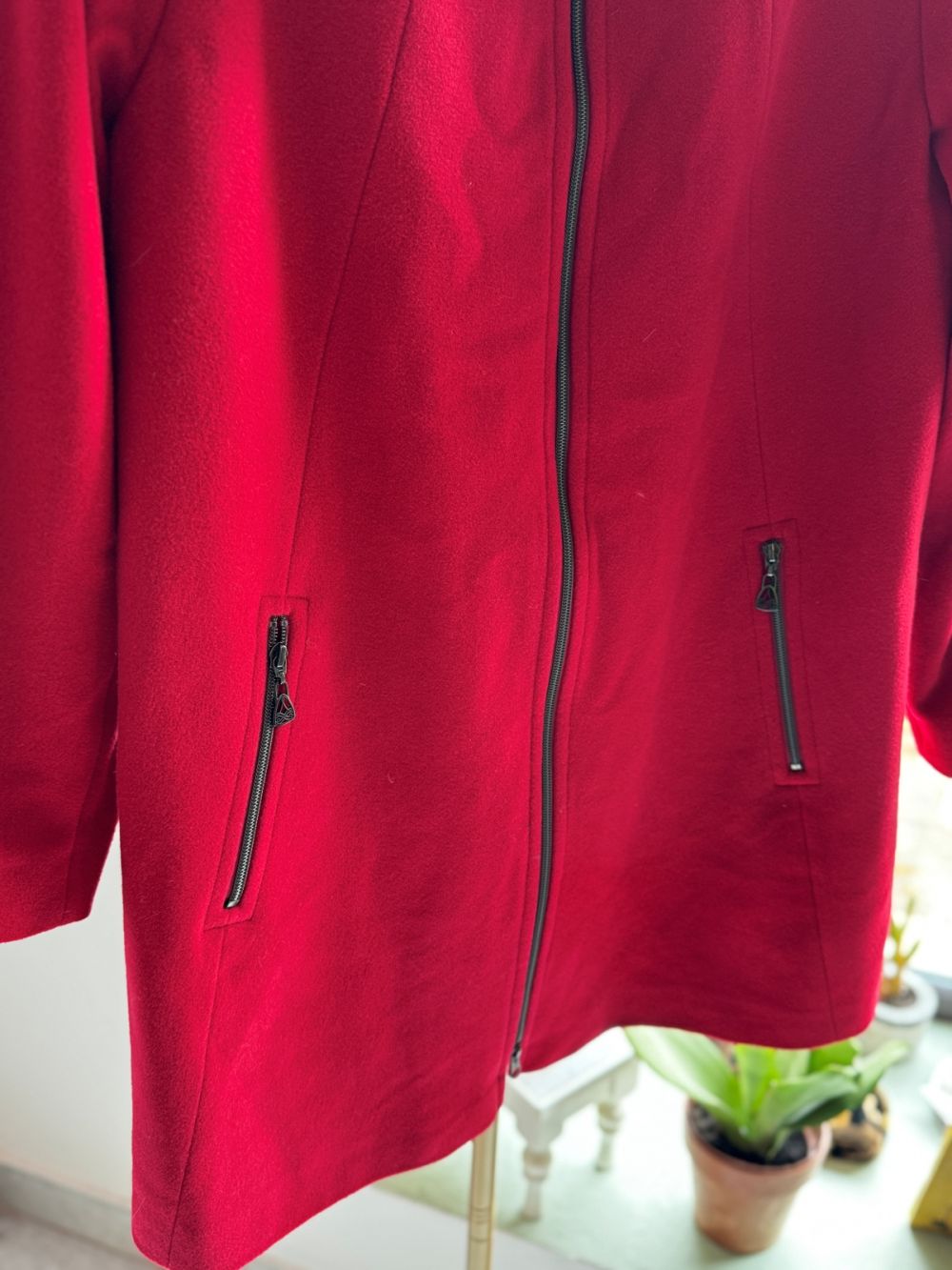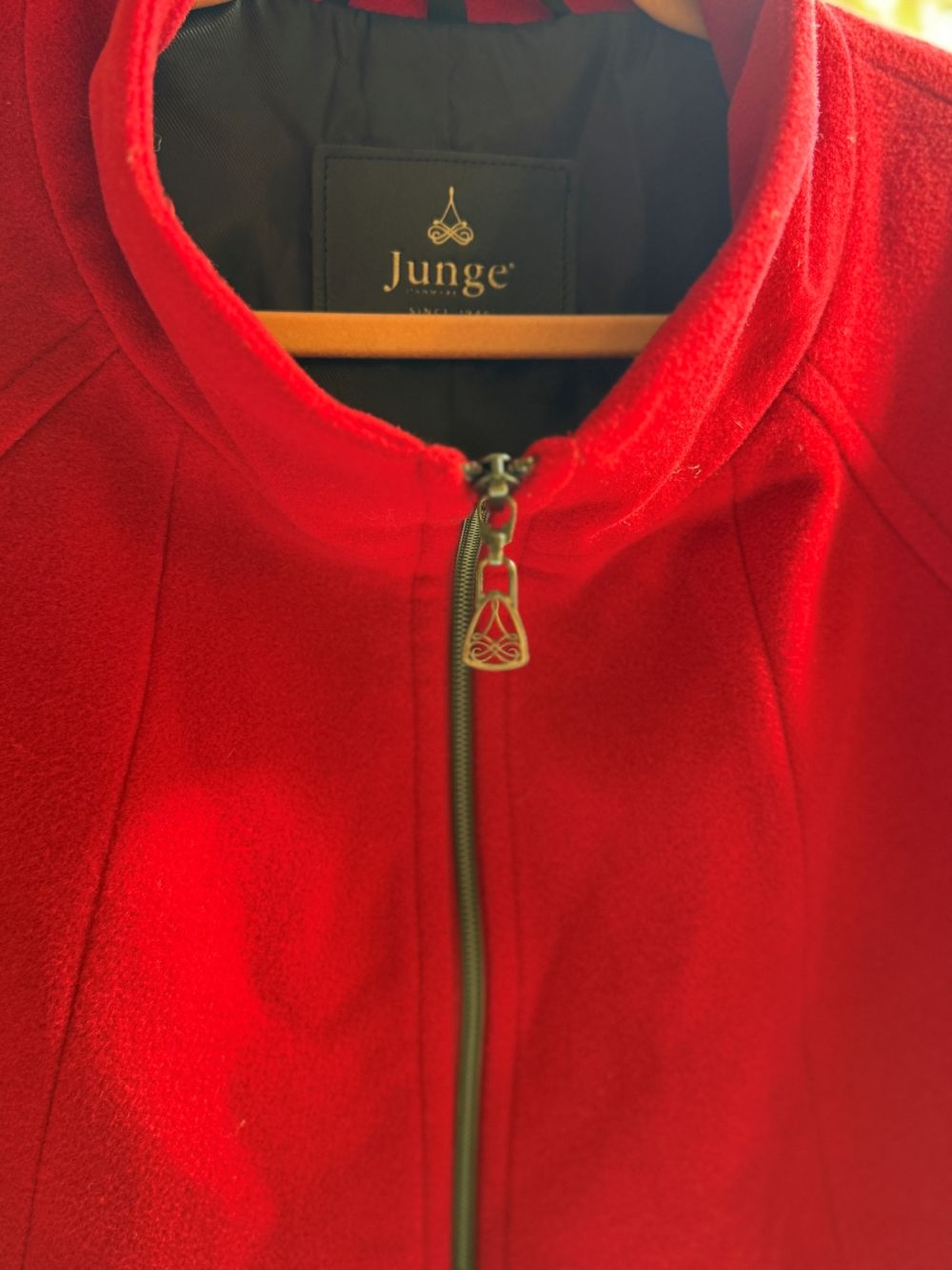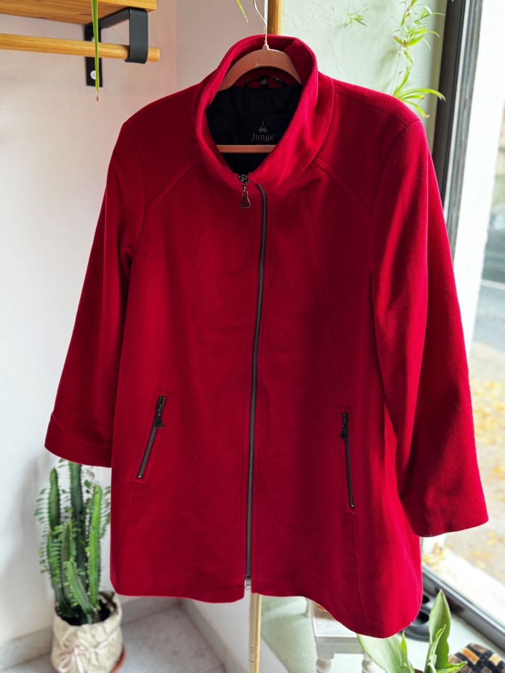 Ciepły i miękki czerwony płaszczyk marki JUNGE. Idealny na jesienne spacery.