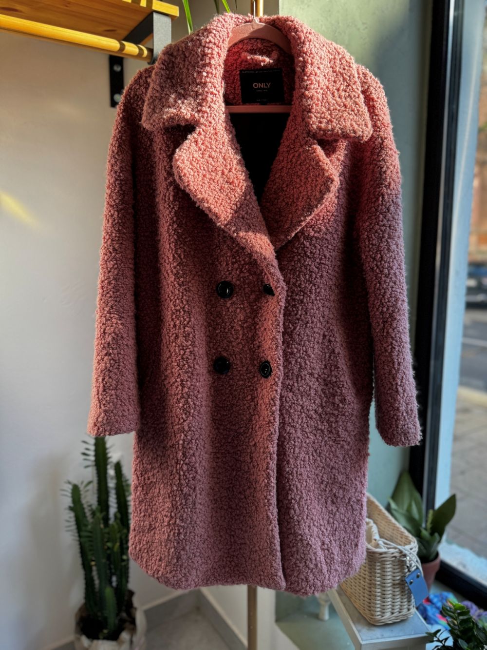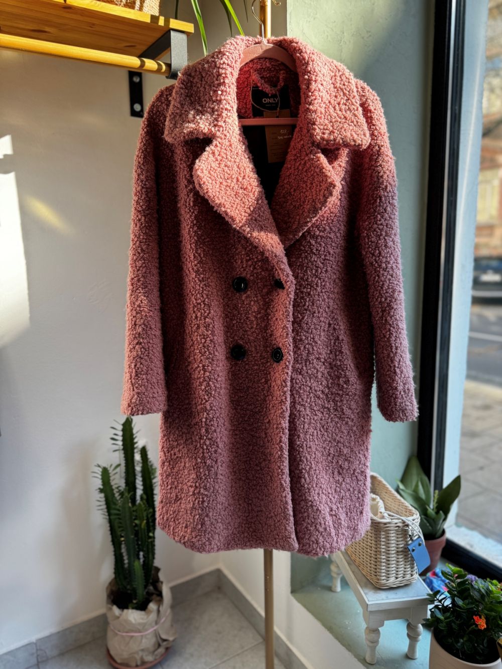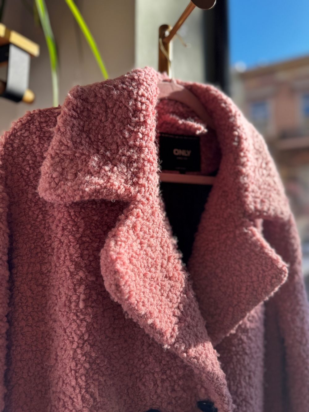 Długi płaszczyk od marki Only. Dzięki różowemu kolorkowi jest bardzo nietypowy.