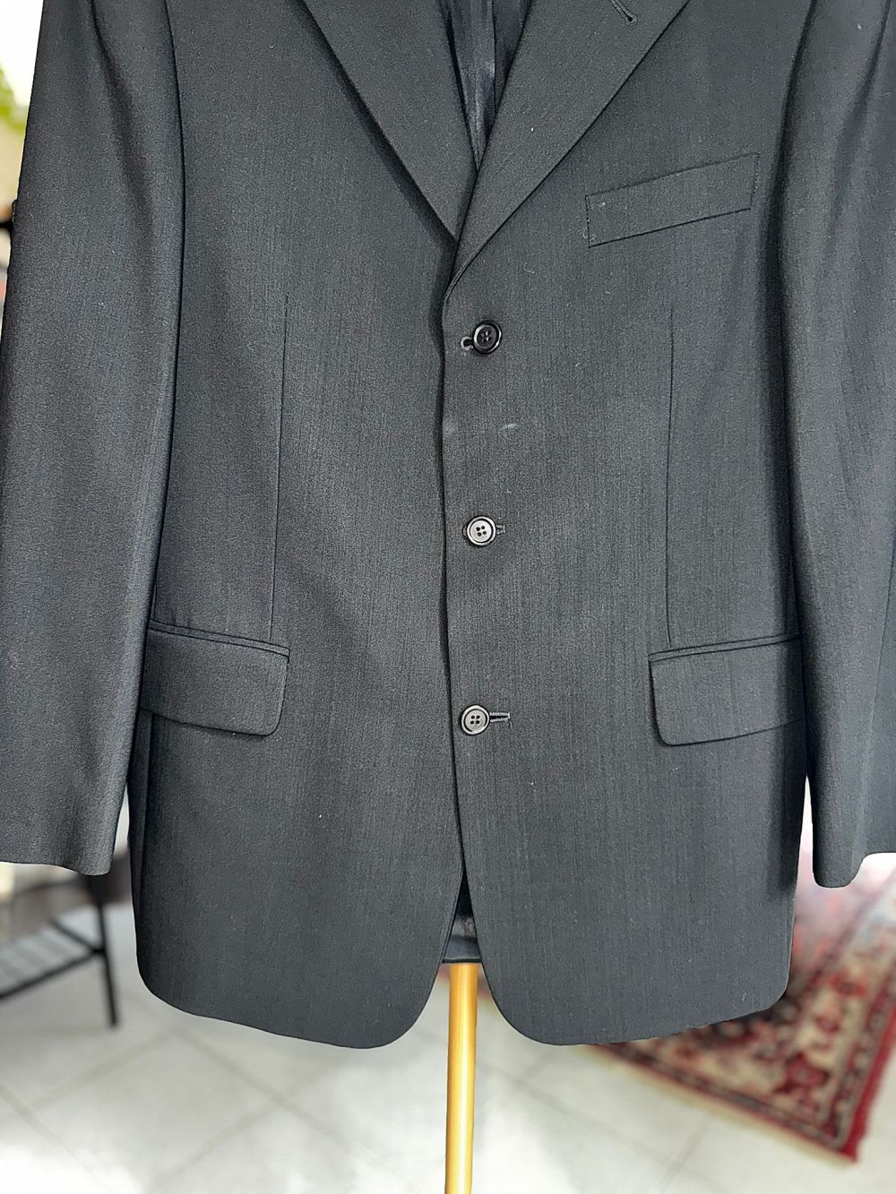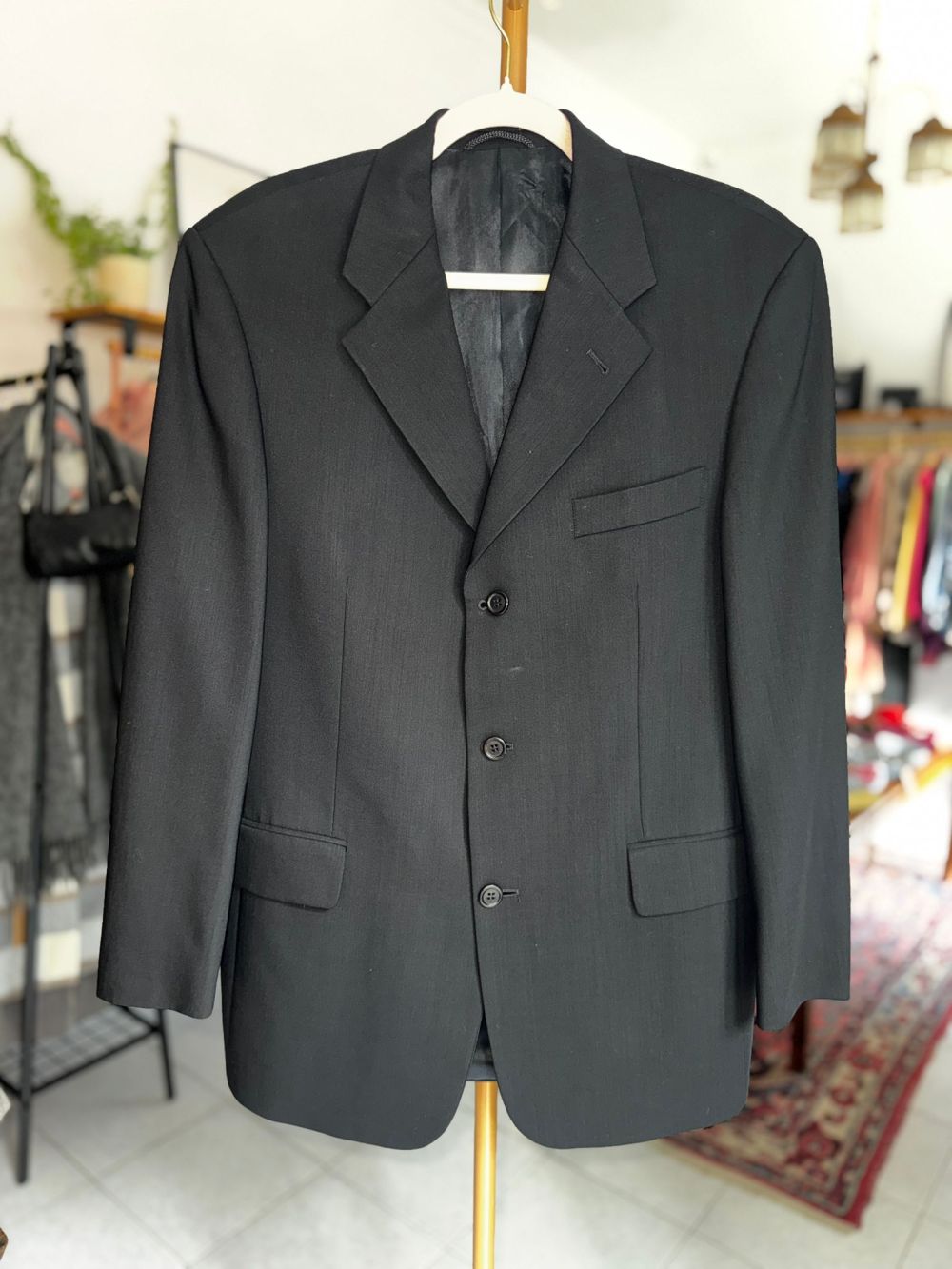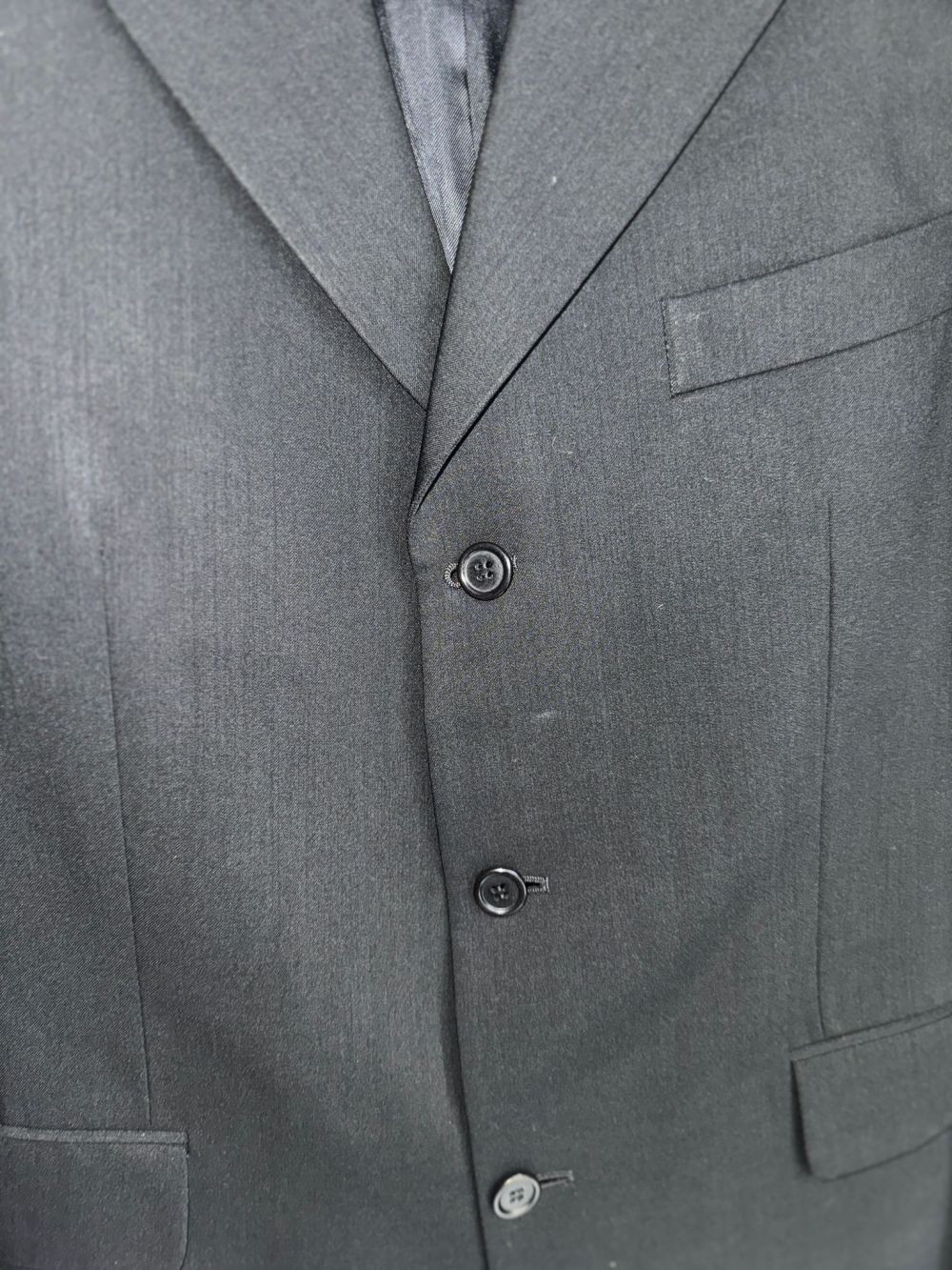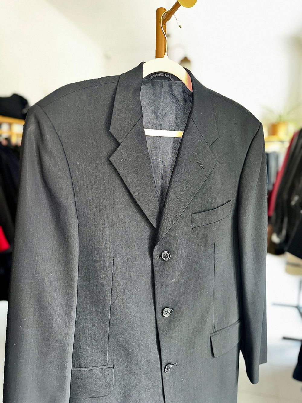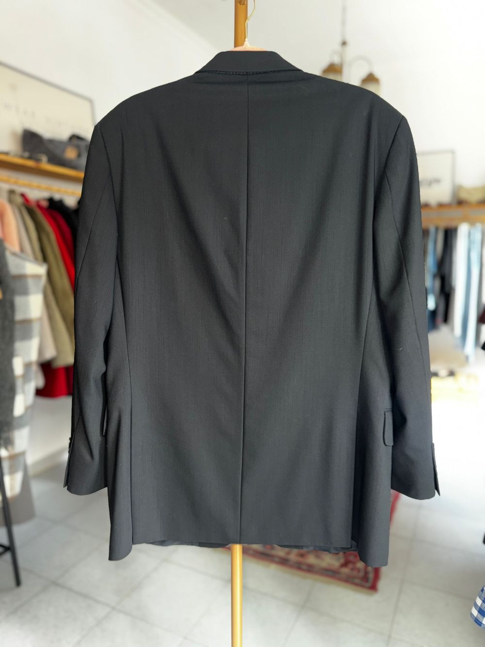 Wełniana marynarka w czarnym kolorze z wiskozową podszewką.