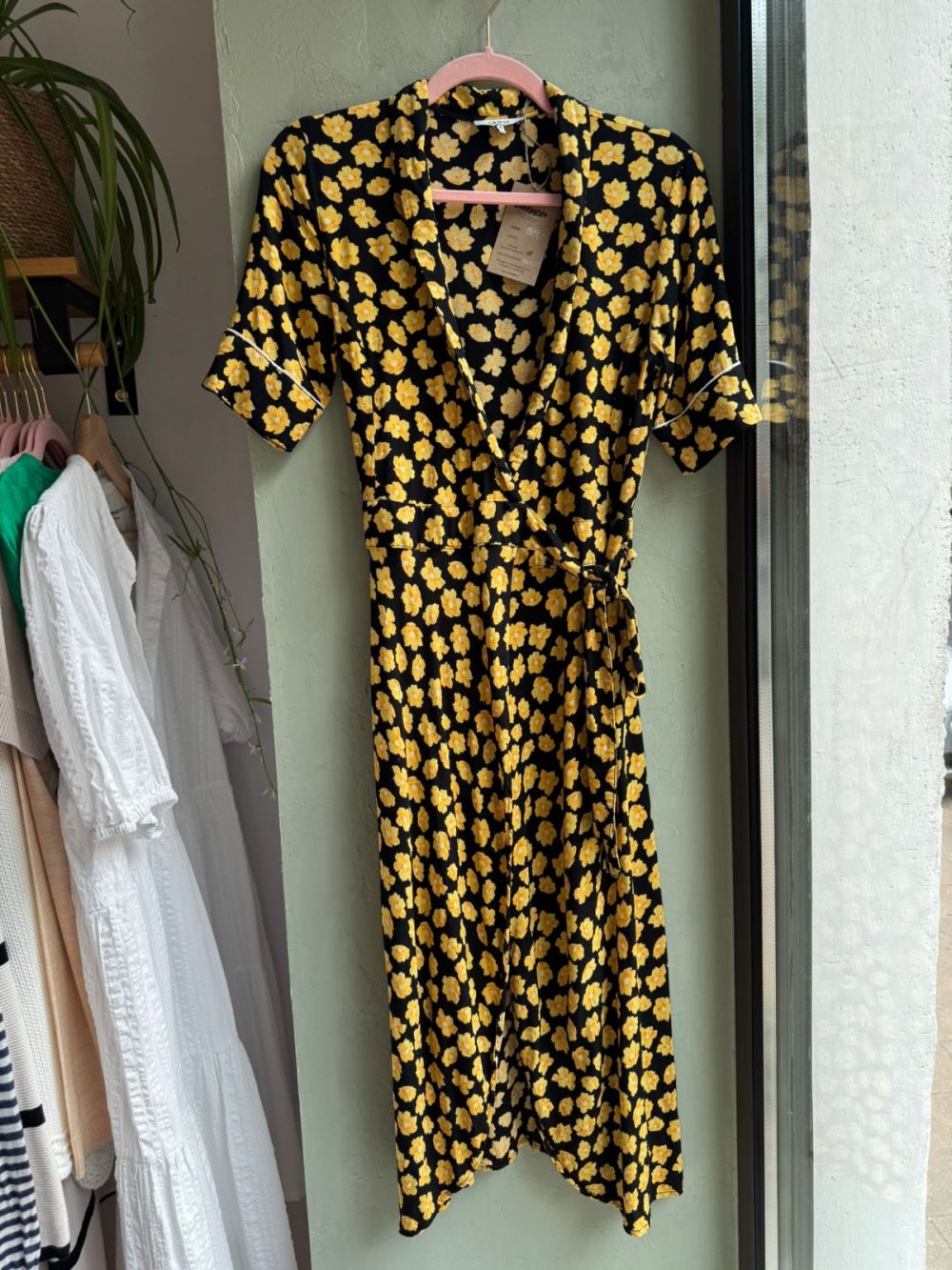 Sukienka kopertówka, czarna w żółte kwiaty. Idealna na ciepłe dni.