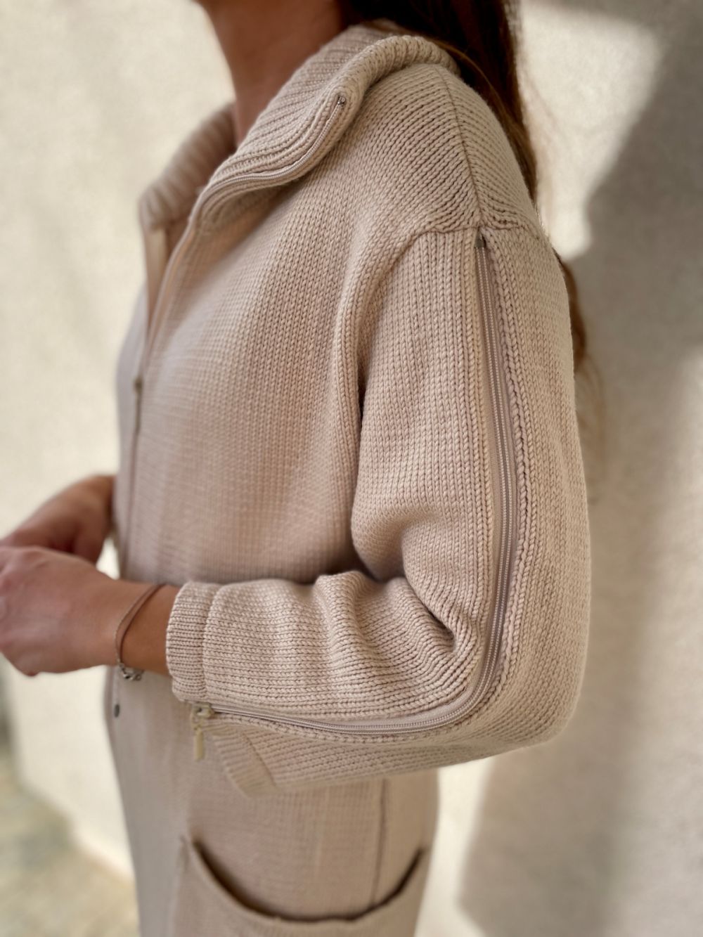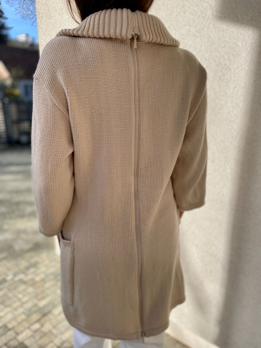 Długi kardigan renomowanej marki BITTE KAI RAND.Z wywijanym kołnierzem. Ozdobiony zamkami na rękawach i na plecach. 100% wełna merino.